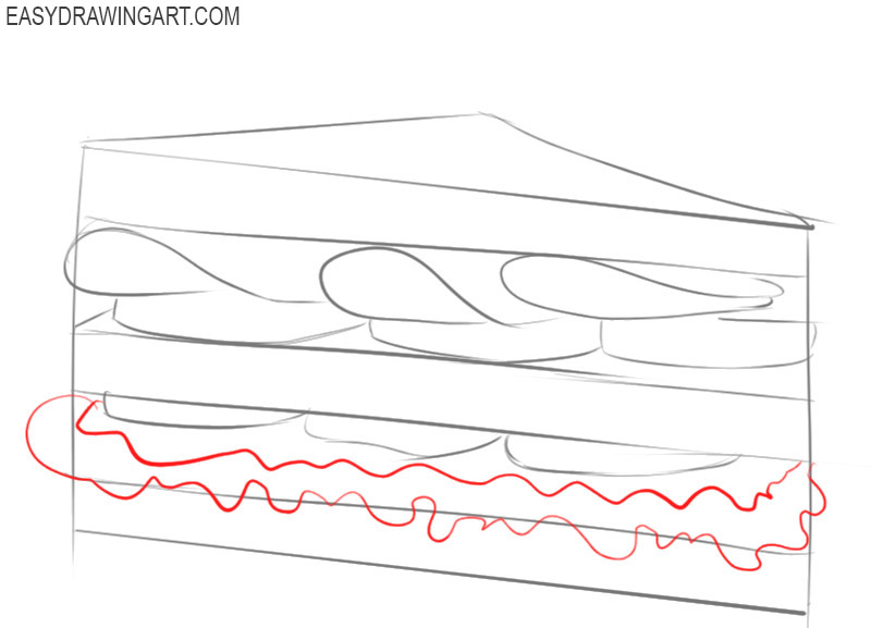 Now, using a pair of light and loose lines, create the upper surface of the sandwich. As you can see, we decided to depict a sliced sandwich, but you can, of course, depict a full square sandwich.
